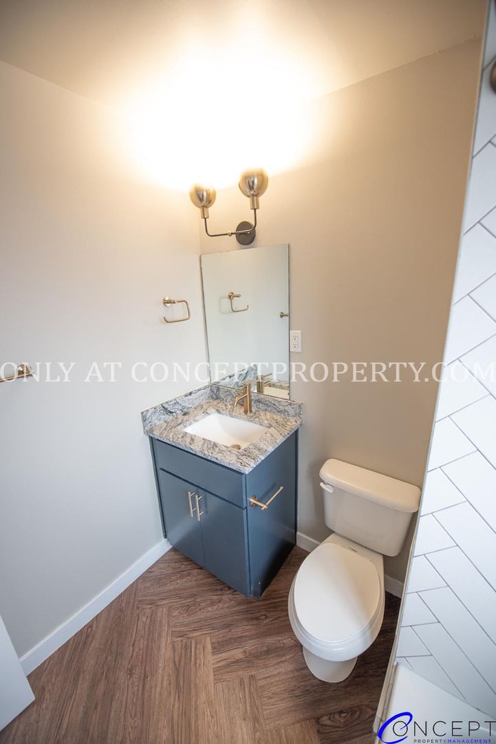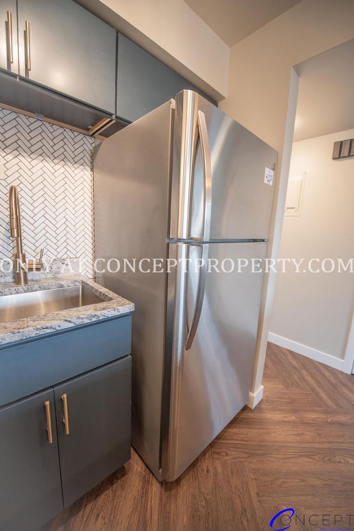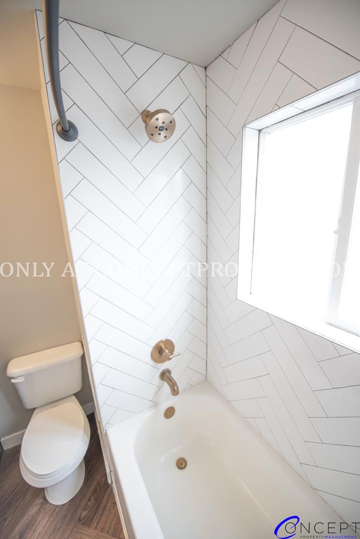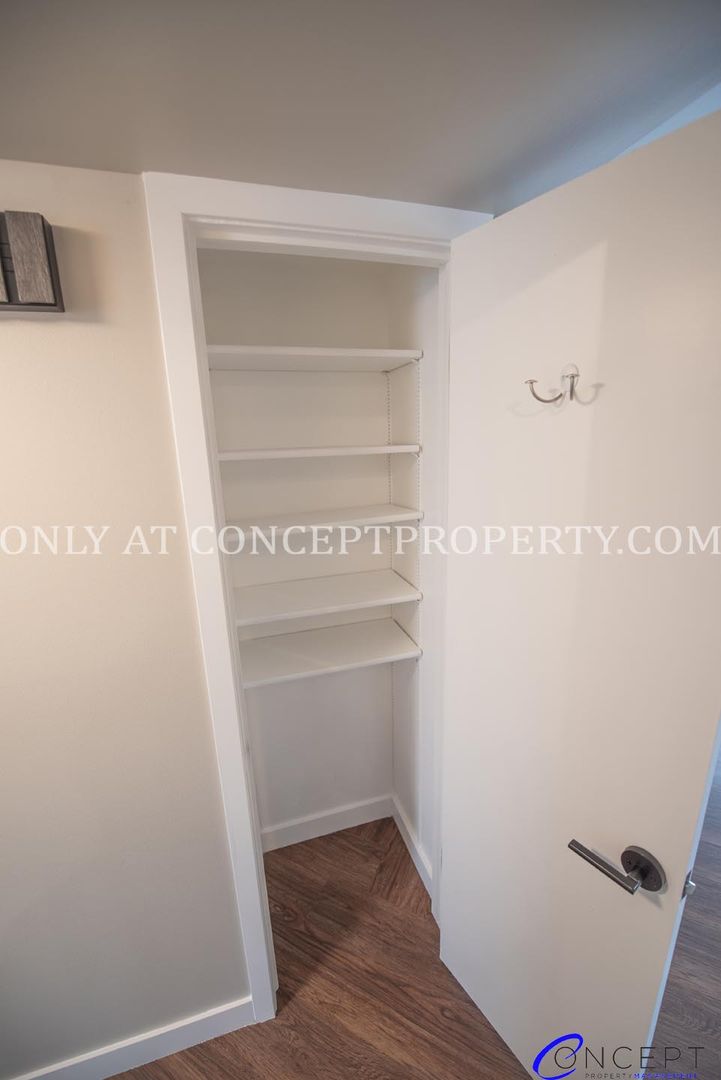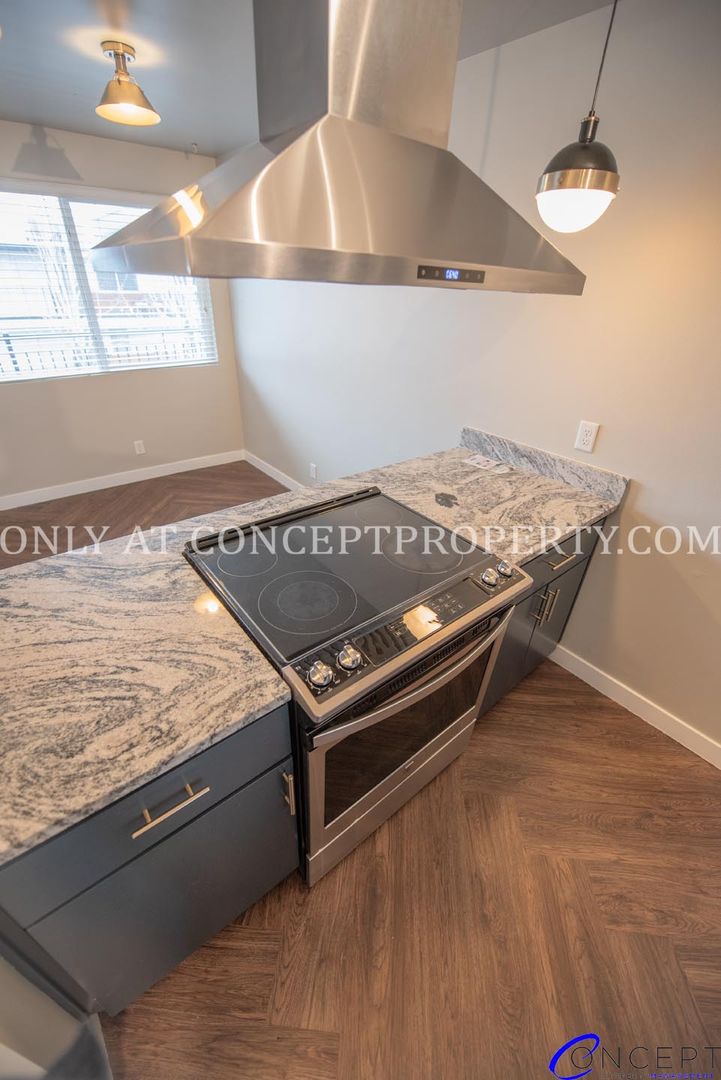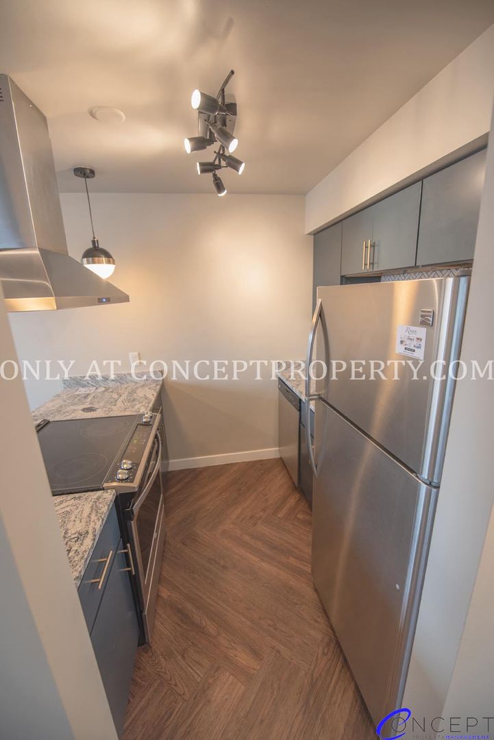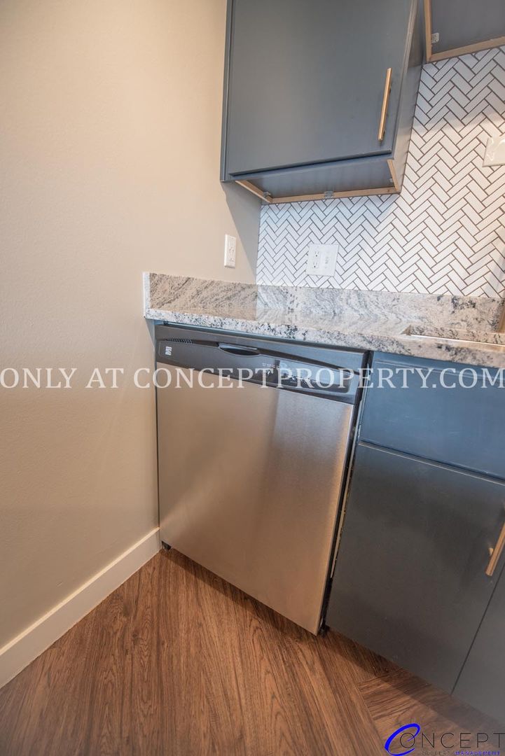 Step into elevated living in this fully remodeled apartment, where thoughtful design and modern finishes come together in perfect harmony. From the rich wood grain flooring to the sleek subway tile backsplash and shower, every detail has been crafted for comfort and style. The open floorplan is flooded with natural lighting, accentuated by pendant and gallery lighting that adds a cozy, curated touch. Your kitchen is a dream, featuring custom cabinetry, granite countertops, stainless steel appliances, and chic brushed brass finishes. With a dedicated dining space, ceiling fans, and a triple door primary closet, this home offers both functionality and flair.