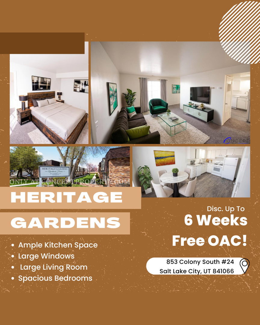 At Heritage Gardens, residents benefit from assigned covered parking, on-site laundry, and responsive local management with 24-hour emergency maintenance. Ideally located just off 900 East, you’re minutes from I-15, I-80, and major bus lines, making commuting simple. From shopping at Brickyard and groceries at Harmons to the charm of Sugar House and a round of golf at Nibley Golf Course, everything you need is within easy reach. Heritage Gardens isn’t just a place to live—it’s a place to thrive.